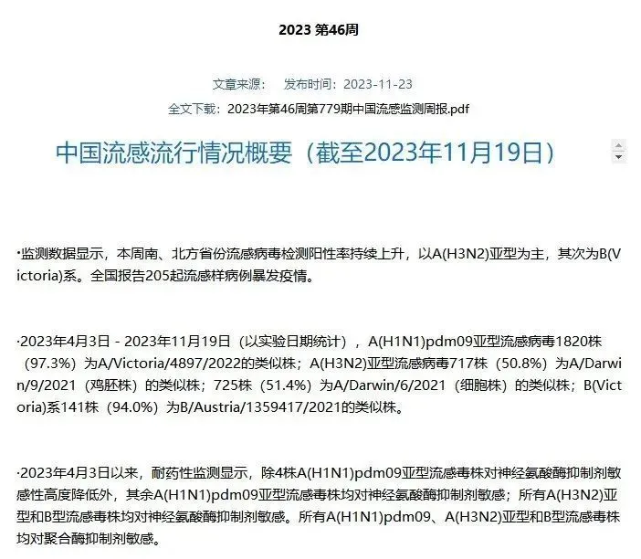 11月23日,中国国家流感中心网站发布了2023年第46周第779期中国流感监测周报。监测数据显示,2023年第46周(2023年11月13日-2023年11月19日),南、北方省份流感病毒检测阳性率持续上升,以A(H3N2)亚型为主,其次为B(Victoria)系。全国报告205起流感样病例暴发疫情。
