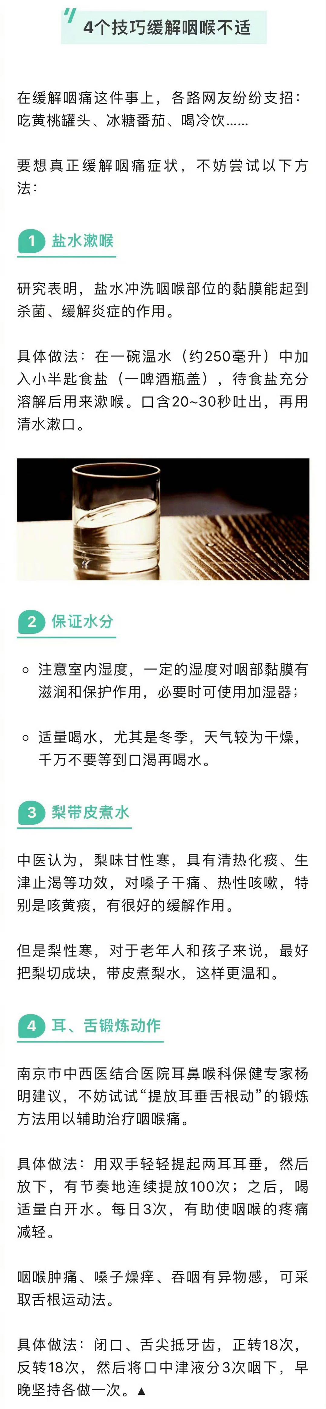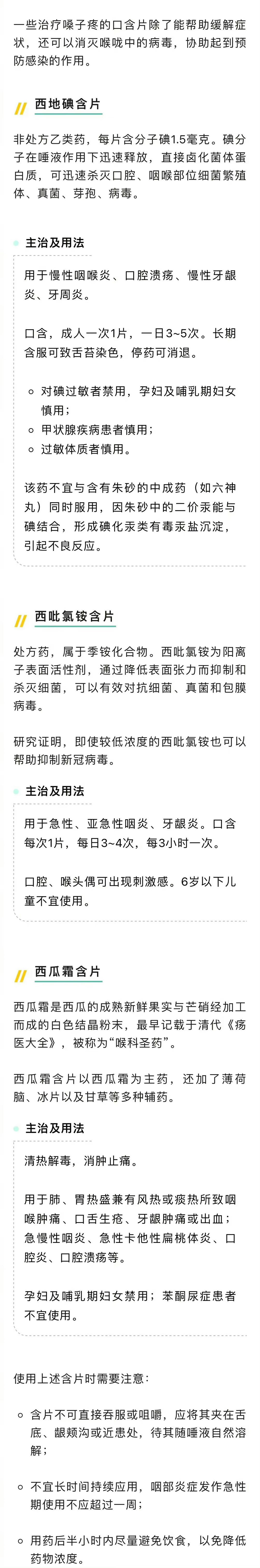 很多人最近出现嗓子疼的情况。一些治疗嗓子疼的口含片,除了能缓解症状,还有助消灭病毒,协助起到预防感染的作用。需要注意的是,含片不可咀嚼或吞服,不宜长时间持续使用,用药半小时内尽量避免饮食。此外,还有几个方法能真正缓解嗓子疼↓