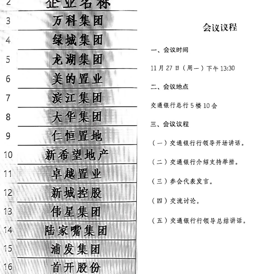 在上海召开座谈会,对房企进行调研,参会人员中包含交通银行副行长、业务总监等领导,以及各部门副总经理等。