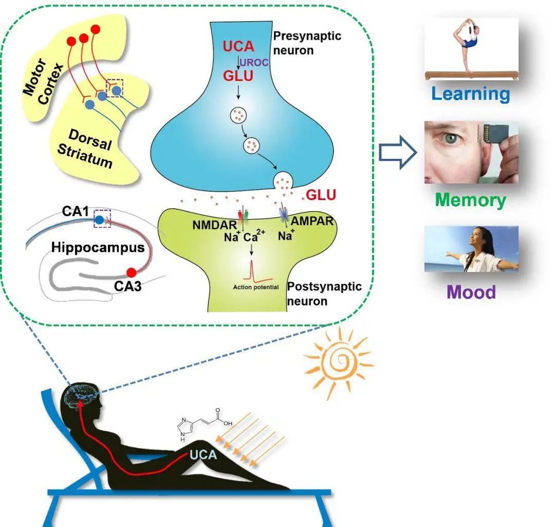 具体而言,在适当的日光浴之后,人体内血液中的UCA水平显著上升,此物质能进一步渗透进入神经元细胞,并在此经过一系列复杂的生物化学反应,最终化为脑部所必需的谷氨酸。