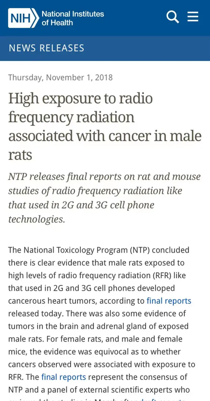2020年,美国国立卫生院发布消息:有明确的证据表明癌症与手机辐射之间存在联系。