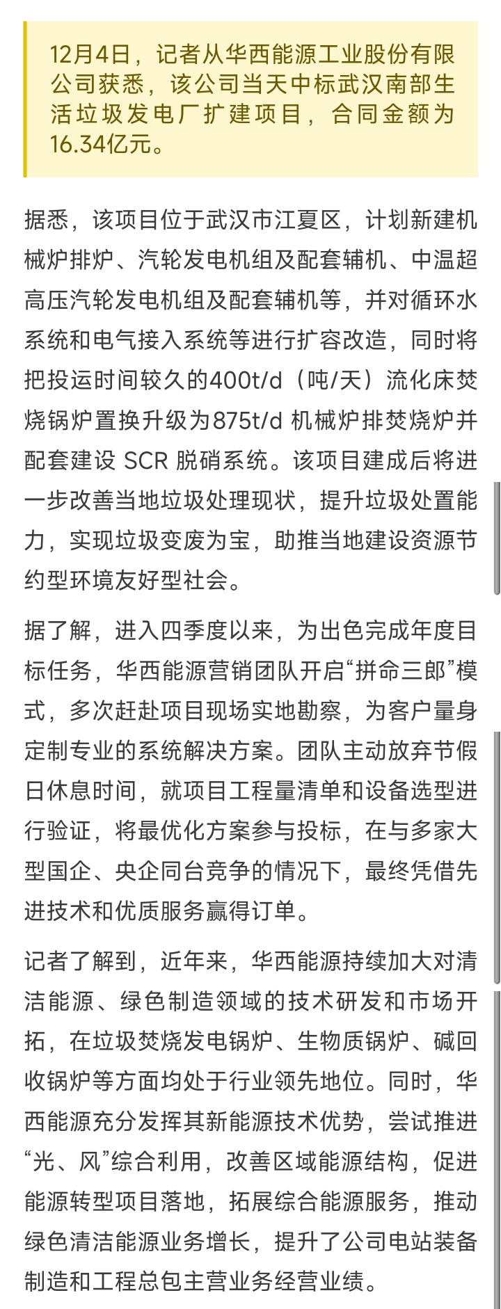 [盐都杂谈] 16.34亿元大单!华西能源中标武汉南部生活垃圾发电厂扩建项目