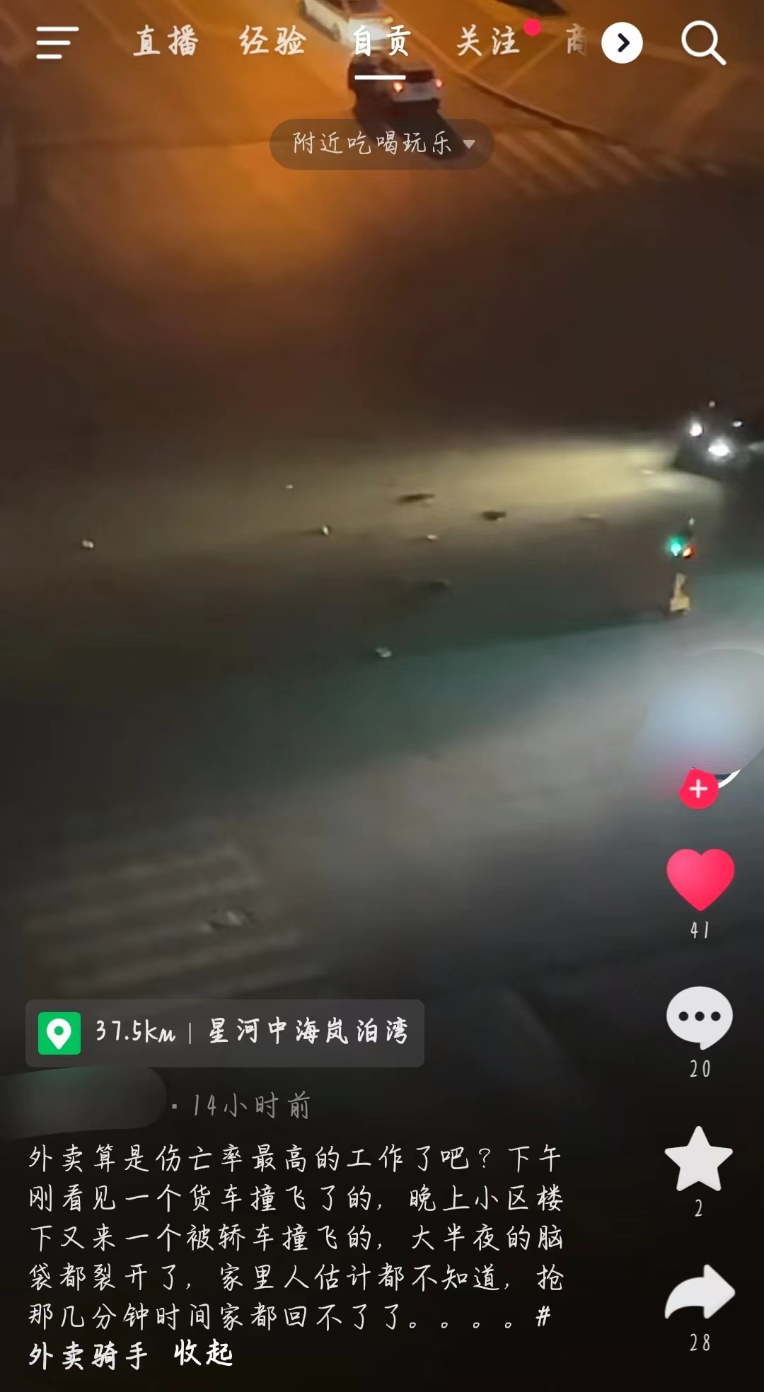 “外卖算是伤亡率最高的工作了吧?下午刚看见一个货车撞飞了的,晚上小区楼下又来一个被轿车撞飞的,大半夜的脑袋都裂开了,家里人估计都不知道,抢那几分钟时间家都回不了了。。。。#外卖骑手”