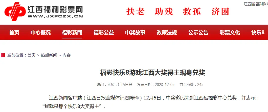 12月5日,江西省福利彩票发行中心官网也刊登了大奖得主现身兑奖的消息:中奖彩民来到江西省福彩中心兑奖,并表示:“我就是那个快乐8大奖得主”。