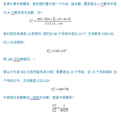 李永乐告诉记者,他根据中国福利彩票官网关于“快乐8”游戏规则,得以计算推断出此结论,具体计算过程如下: