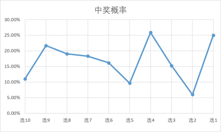 李永乐介绍,利用这种方法,他把选10的所有情况都计算出来,就得到了各种情况的中奖概率。利用同样的方法,就可以计算出其他更多情况的中奖概率。如果画出中奖概率图,就会发现:选4中奖概率最高,大约有25.8%;选1其次,为25%;买选1或者选4,大约每4次能够中奖1次。选2中奖概率最低,大约每16次才能中奖1次。