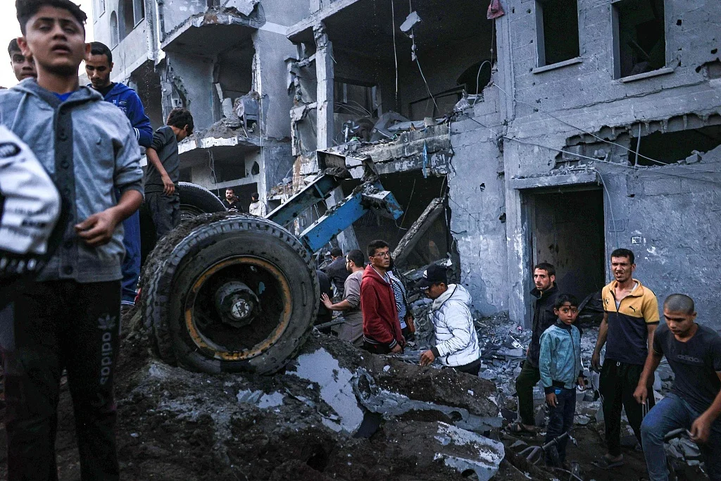 12月3日,加沙地带南部拉法,巴勒斯坦人在以色列空袭后检查损坏情况/视觉中国