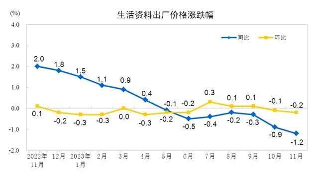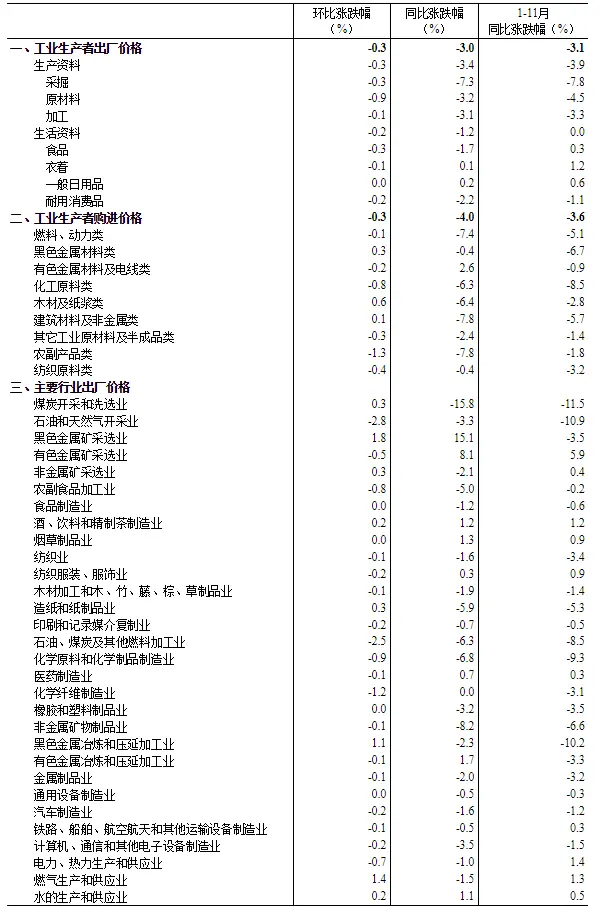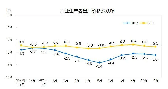 2023年11月份,全国工业生产者出厂价格同比下降3.0%,环比下降0.3%;工业生产者购进价格同比下降4.0%,环比下降0.3%。1—11月平均,工业生产者出厂价格比上年同期下降3.1%,工业生产者购进价格下降3.6%。