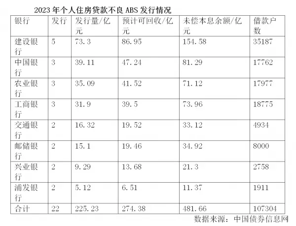 中国债券信息网数据显示,2023年建设银行个人住房抵押贷款不良ABS已经发行5单,发行规模为73.3亿元,涉及35187户借款人,居于行业前列。