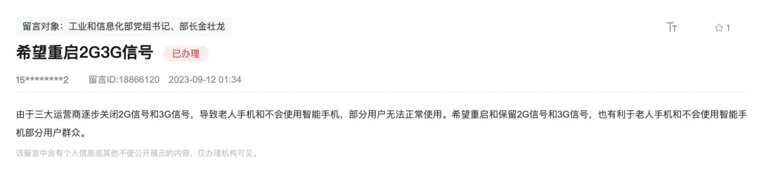 9 月份的时候呢,有个人留言说希望能够重启 2G 、 3G 信号,因为很多老人机都没法儿正常使用了。