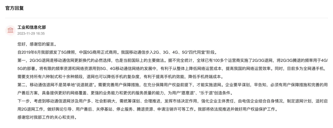隔了俩月,工信部这边给了回复,总结下来就一句话 “ 2G 、 3G 退网是必然选择 ” 。