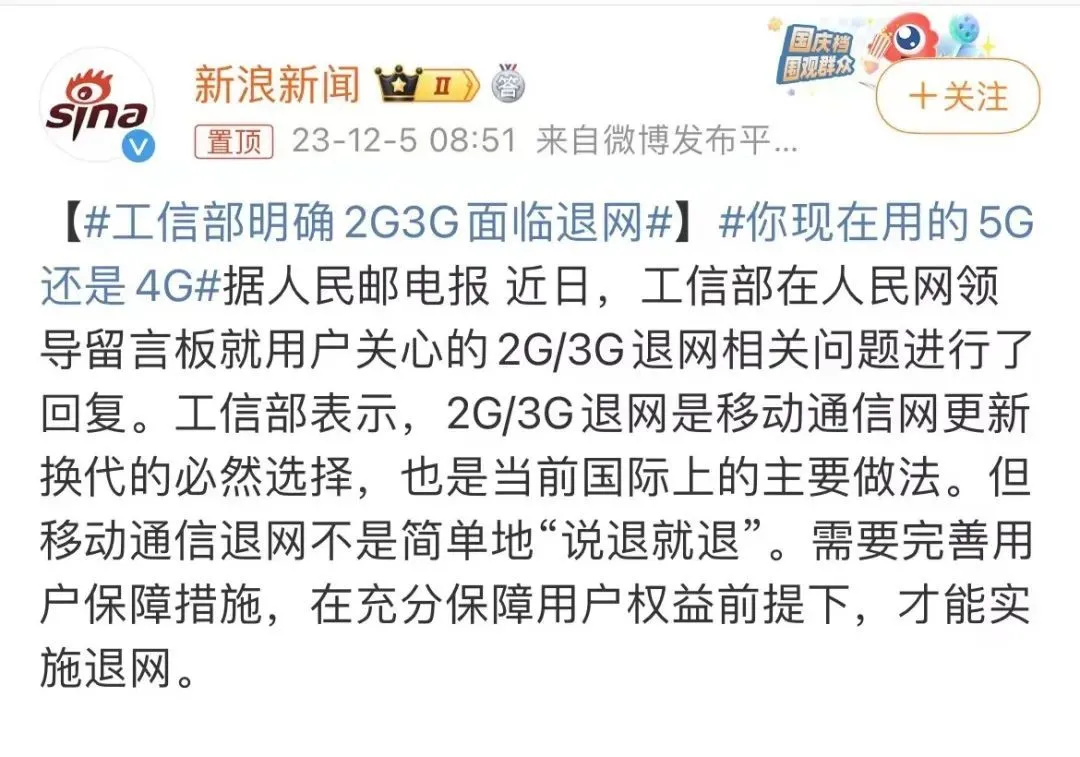 所以2G 、 3G 退网基本上是个大趋势,发酵了这么久,今年更像是在下最后通牒。