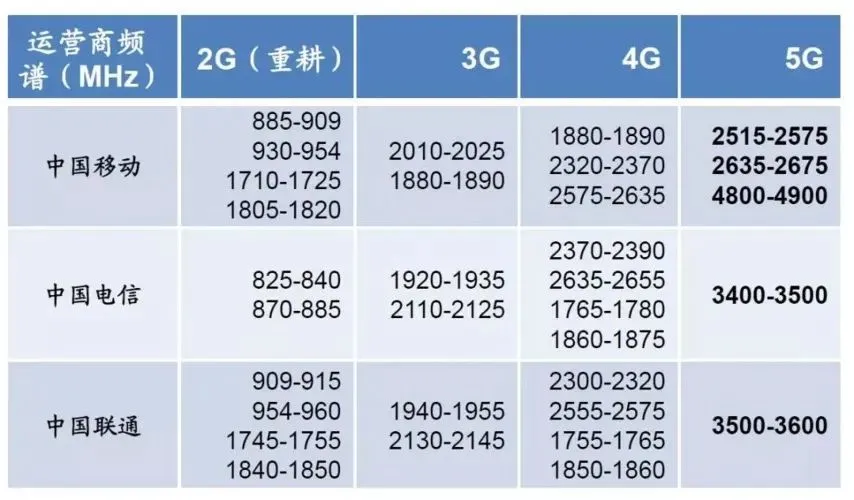 像中国移动, 2G 的 GSM 系统就一直占用着 900MHz 和 1800MHz 这俩黄金频段,而 5G 主要在高频,比如 2.6GHz 和 4.9GHz 。