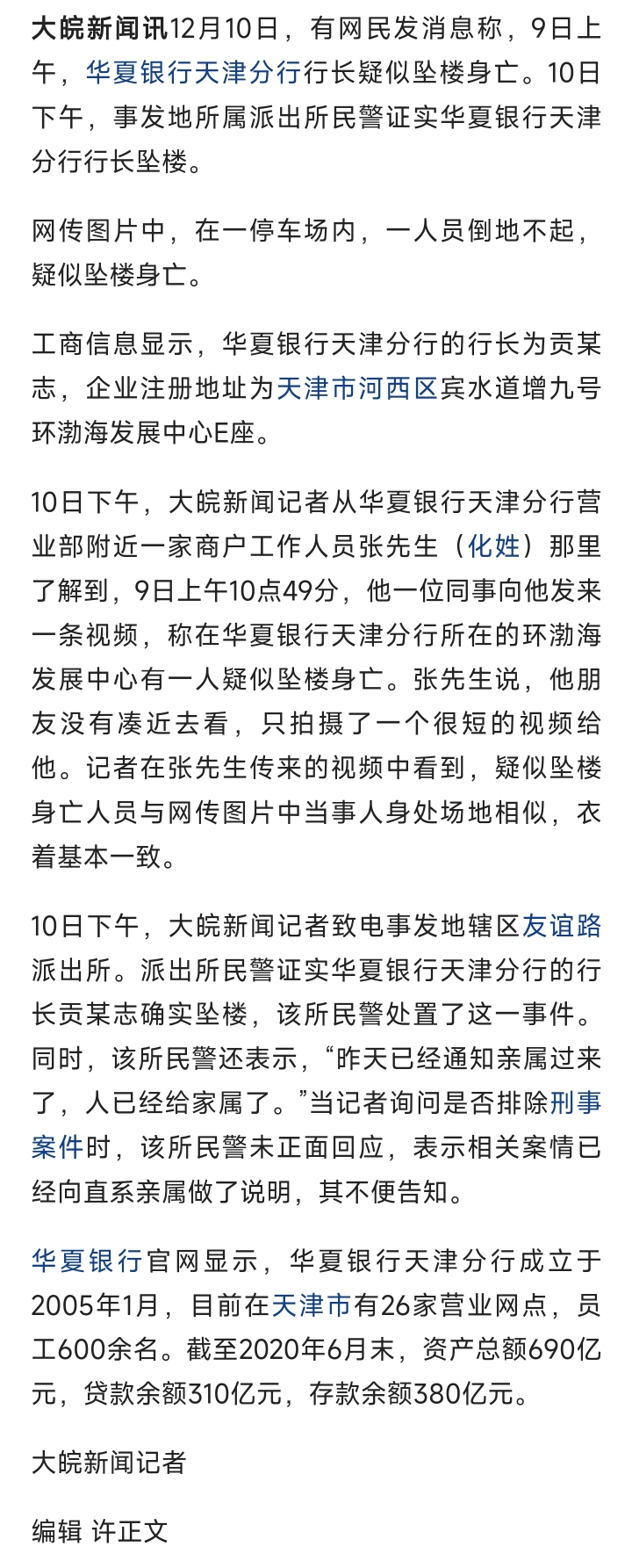 [盐都杂谈] 派出所证实华夏银行天津分行行长贡某志坠楼身亡