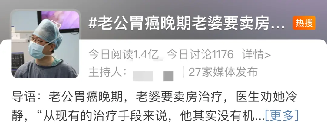 这两天 一则关于 “老公胃癌晚期, 老婆该不该卖房治疗”的话题 迅速登上热搜 引起网友的广泛讨论
