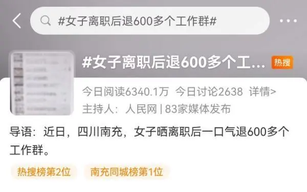 最近,一女子离职后退了600多个工作群引发热议。据报道,四川南充的唐女士曾从事商场地产设计工作,每个商场都有数百个店铺,需要她逐一审核店铺设计图纸,因此积累了庞大数量的工作群。离职后,她花了3个半小时与这些群做了“断舍离”。