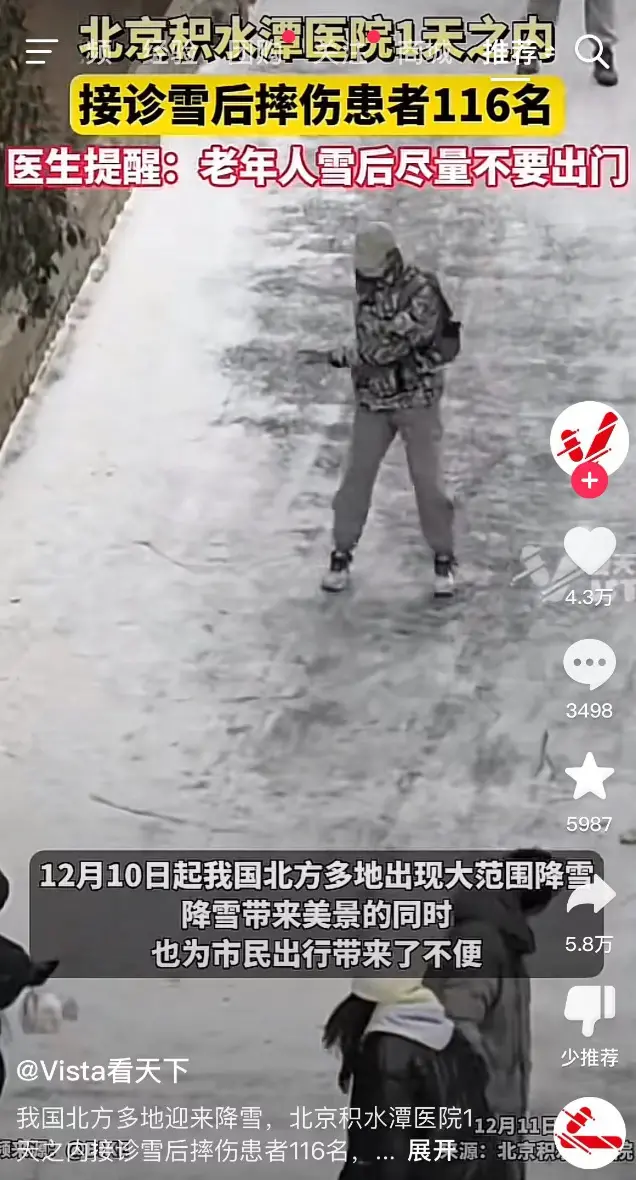 雪后路滑,一不留神就可能摔倒。有的人可能拍拍屁股站起来没啥事,但有些人,特别是老年人,摔一跤,就骨折了。据北京青年报报道,12月11日,北京积水潭医院接诊雪后摔伤的患者比例明显增加,截至17点,三个院区共接诊116名摔伤患者。