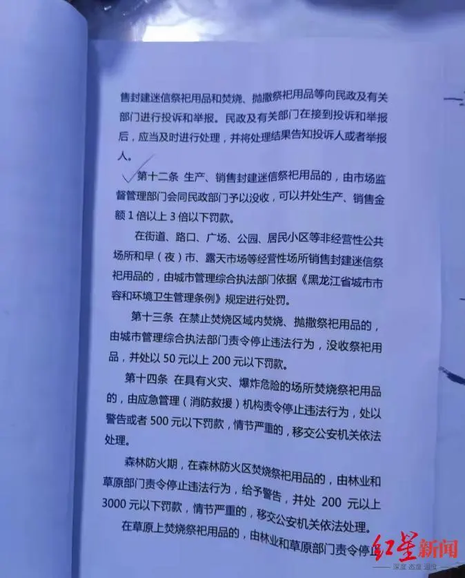 而红星新闻记者以市民身份咨询该县12345市民服务热线,得到回复称:“市场监管局说这是按照政府要求排查安全隐患,不能搞封建迷信,有冥纸的很多家都已经没收了。”