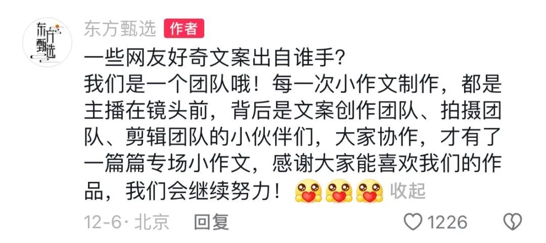 ——12月5日,东方甄选的小编突然在评论区声明,每一次小作文都是文案创作团队写的,引发董宇辉的粉丝们不满。