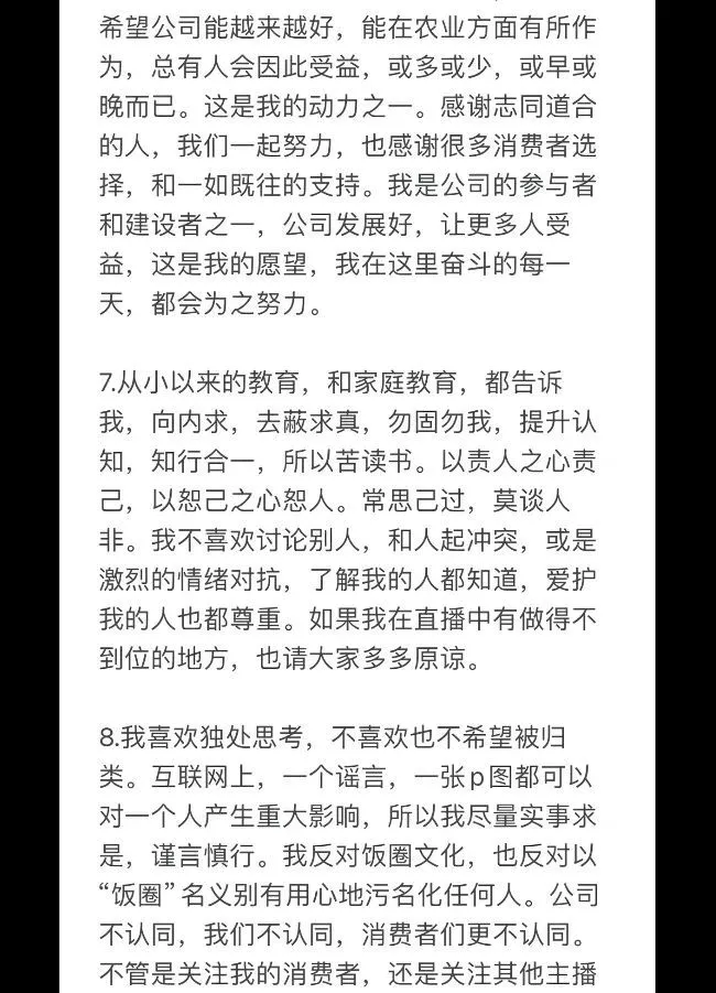 “公司和我们的主播坚决向饭圈文化说不,宇辉今天也跟我表态,会发布反对饭圈文化的声明,请粉丝们保持冷静,请部分粉丝不要以爱的名义害了我们的主播,让我们共同维护积极阳光的网络氛围和良好的购物环境。”
