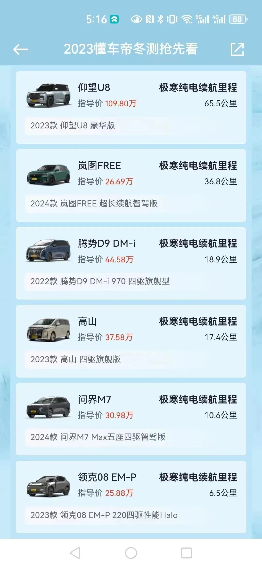 而在此前“2023懂车帝冬测”中,比亚迪仰望U8的续航达成率为85.08%,排名第一;问界新M7测试成绩不佳,续航达成率仅为31.6%;吉利、长城旗下的多款车型在测试中续航达成率均不足40%。