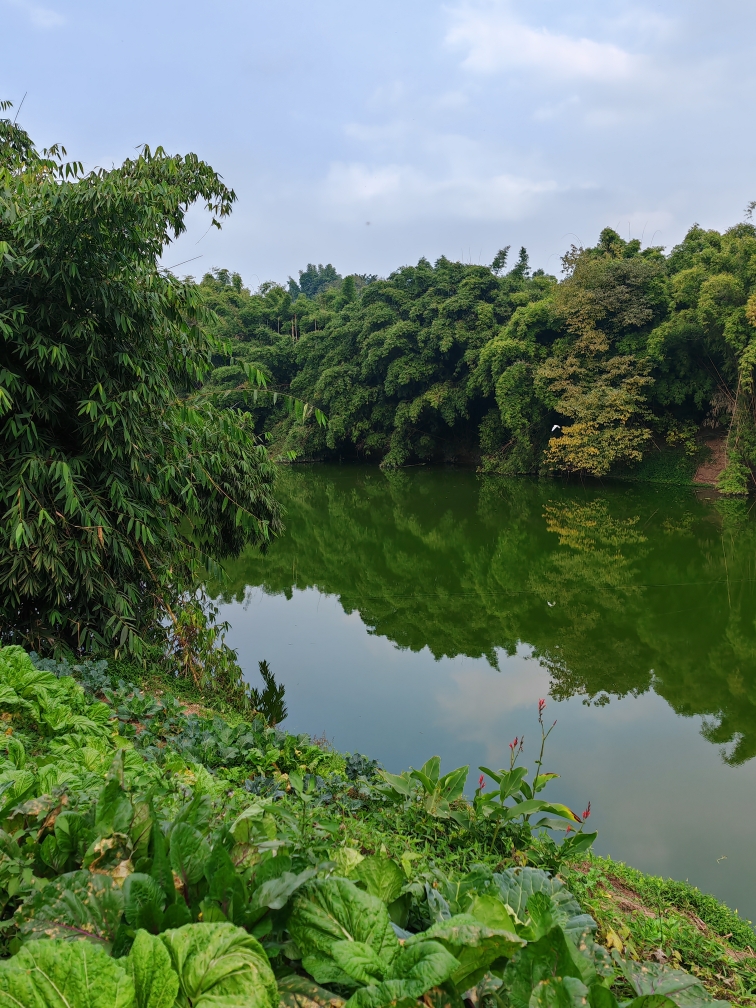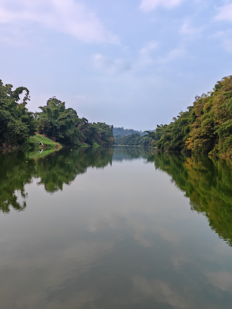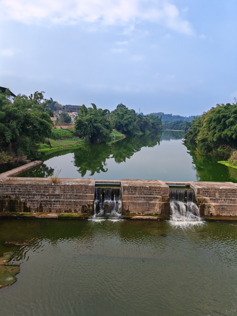 这是观音滩堰闸的上游,碧水如镜,竹林树林成荫(这是冬天,春天应该更美)。