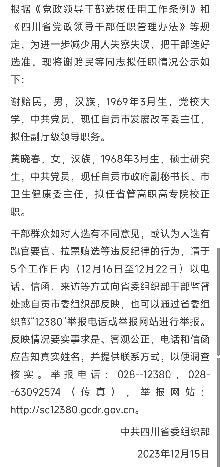 [盐都杂谈] 中共四川省委组织部发布干部任前公示