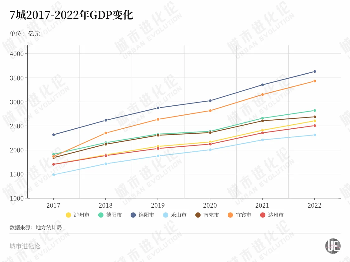 2017年,七座城市只有绵阳GDP站上了2000亿元。到2022年,在全省经济排名第2-8位的依旧是这7座城市,大家的经济体量集体往前迈了一步,全部迈过2000亿元。
