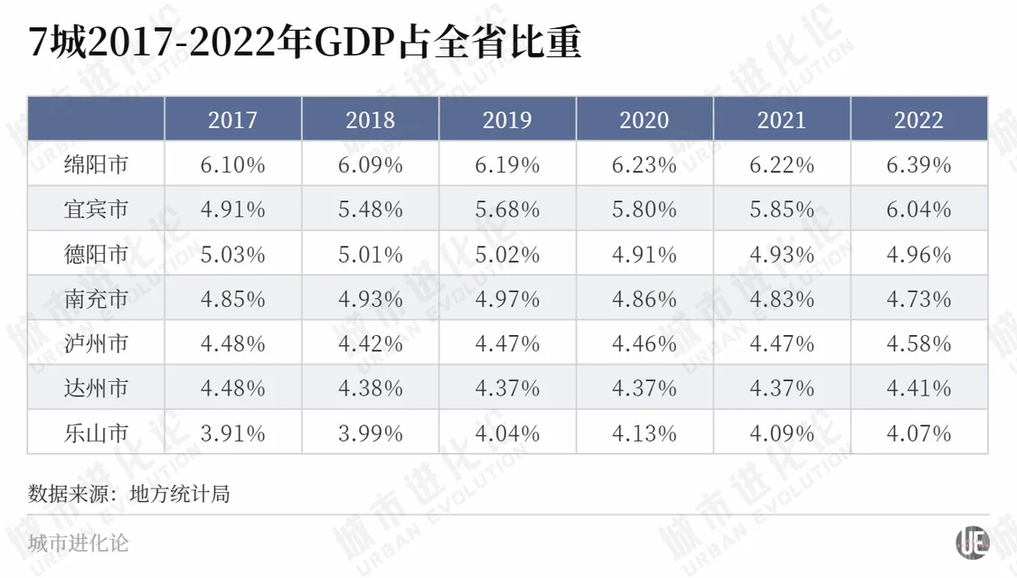 对比其他六城,从2017年到2022年,绵阳GDP占全省比重提升了0.29个百分点,乐山提升了0.16个百分点,泸州提升了0.1个百分点。南充、德阳、达州的占比则在下降,分别下降了0.12、0.07和0.07个百分点。