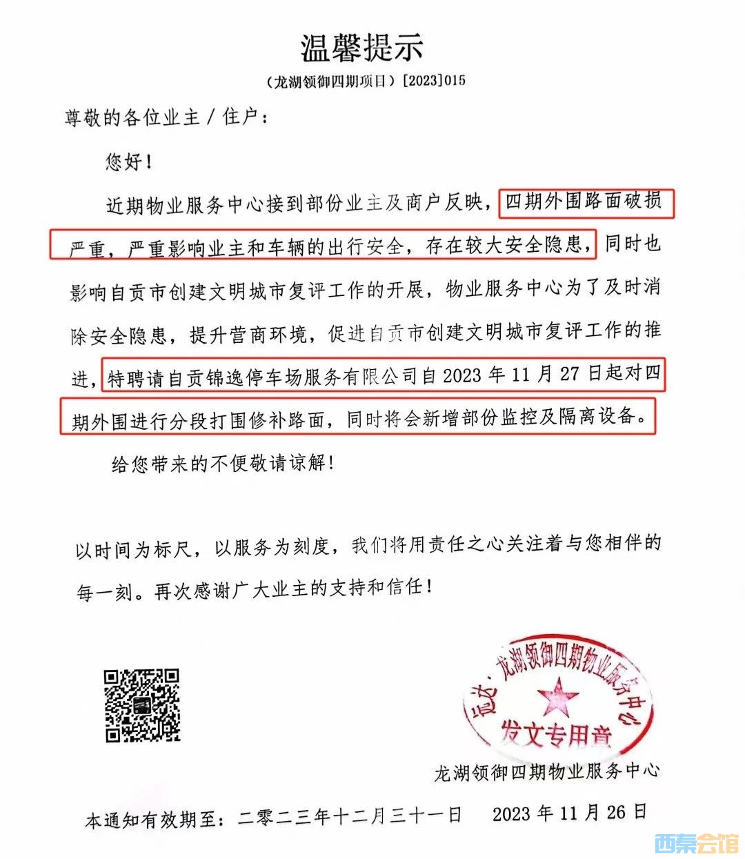 下面的这个物业公司说的修补路面增加监控等等冠冕堂皇的口水话其实真正目的就是告诉你我要收停车费了,但是借口要找好,真要是只是影响业主出行,你物业大可以修补好了路面就可以了啊,还聘请了停车服务公司,还在为了业主的利益,话说得多么的大方得体头头是道,然后后续停车道闸一装,业主是啥!啥都不是。