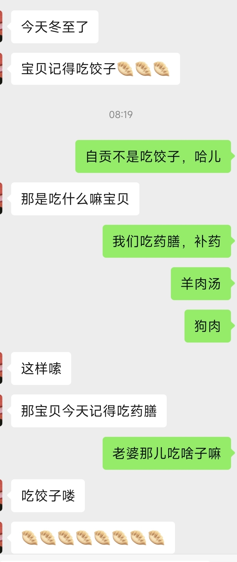 但是很想念小时候习惯吃的那些(补药,羊头汤,从小到大我的记忆里冬至没吃过饺子,出差在北方冬至吃饺子,而且感觉北方人只要有重要节日都酷爱吃饺子,正如现在的我想吃一下小时候吃的补药,也许这也是一种乡愁吧。)