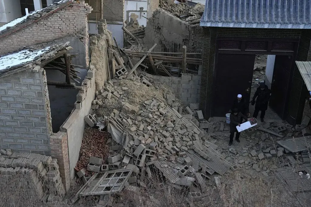 2023年12月20日,甘肃临夏,积石山县大河家镇附近的杨洼村,村民们走过倒塌的房屋。图/视觉中国