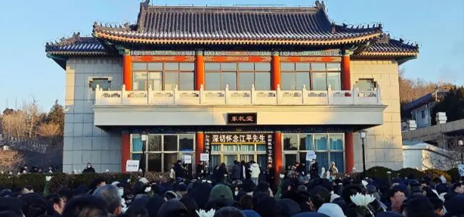 早上7点多,前来悼念的人群就已排起百米长队,零下10度的空气十分静穆,礼堂门口悬挂着“躬耕教坛七十载师思无尽众生喁望,弘道法治九万里德业百年永世流芳”挽联,江平的弟子龙卫球、王涌等在礼堂外迎候。