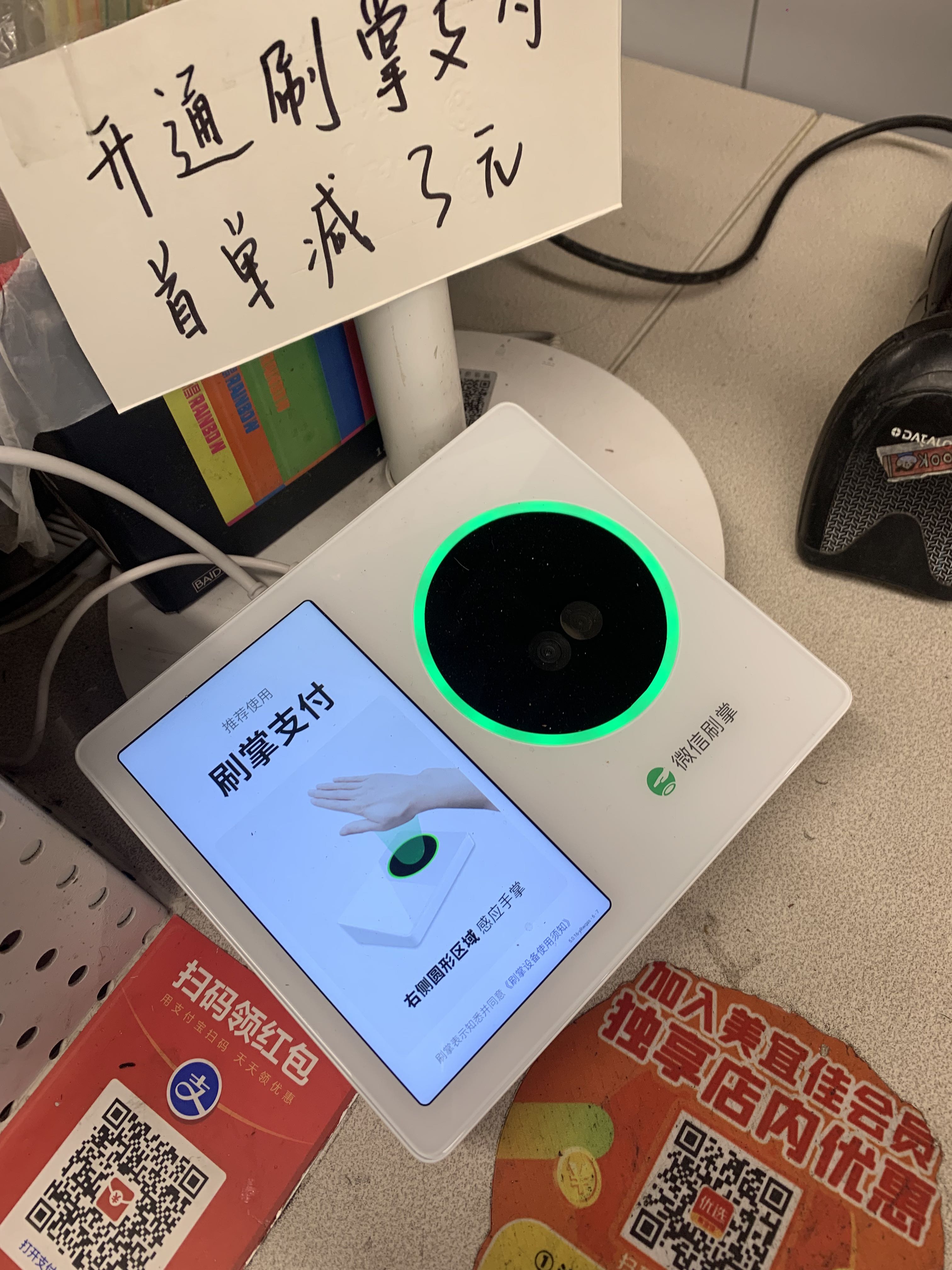 今天逛美宜佳华商店,居然看到微信传说中的刷掌支付,这东西有利有弊,要看个人的介意程度和看法了!据说首单大于三元还能立减三元