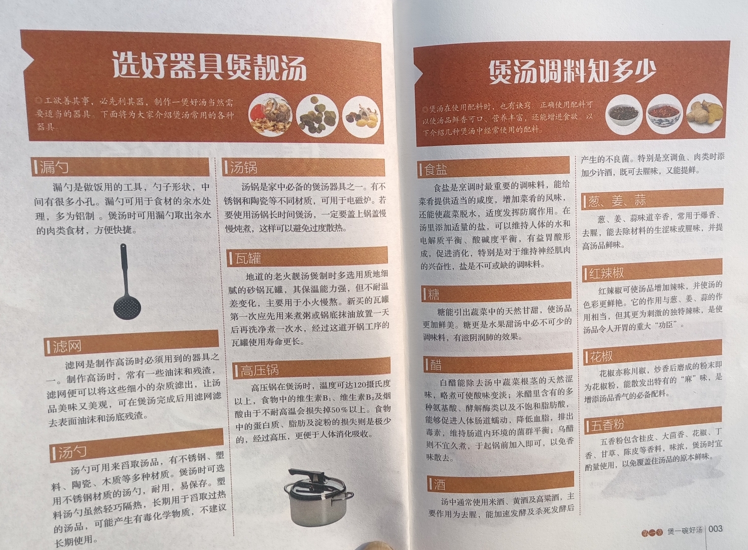 煲一碗好汤制汤,是将各种营养素丰富的食材原料放在水锅中长时间熬煮,使原料中的各种营养物质溶解于水中,制成鲜美的汤,以供烹调或食用。汤是烹制菜肴必不可少的调味品,汤的质量好坏对菜肴的影响很大,特别是鱼翅、海参、燕窝等珍贵而本身又没有鲜味的原料,全靠精制的汤提鲜增味。汤还是餐点中不可或缺的部分,它能增进人们的食欲,还能润口润胃。因此,制汤是一项很重要的工作。本部分将为大家介绍一些和熬制汤品有关的小窍门。