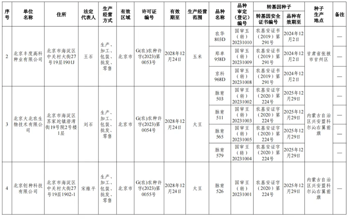 具体来看,其中有26家企业获转基因玉米、大豆种子生产经营许可证,包含隆平高科子公司北京联创种业、河北巡天种业、湖北惠民;大北农旗下北京大北农生物技术有限公司、北京创种科技有限公司、北京丰度高科种业有限公司、云南大天农业有限公司;登海种业;河南金苑种业;中国种子集团有限公司;丰乐种业(000713.SZ)旗下四川同路农业有限公司等。