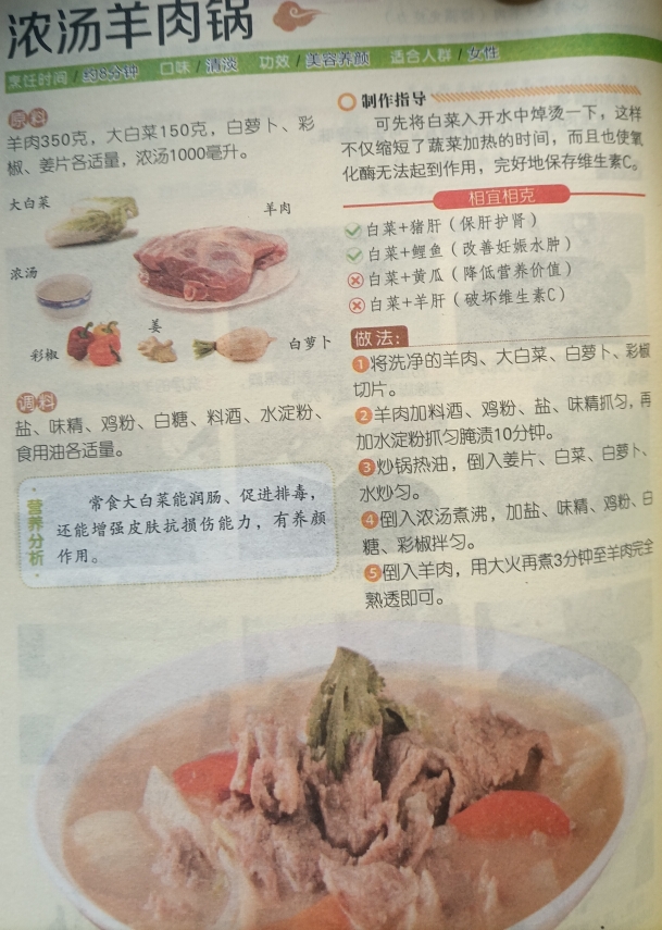 原料:羊肉350克,大白菜150克,白萝卜、彩椒、姜片各适量,浓汤1000毫升。辅助原料:白萝卜,大白菜各少许。制作指导流禾至:可先将白菜入开水中焯烫一下,这样不仅缩短了蔬菜加热的时间,而且也使氧化酶无法起到作用,完好地保存维生素 C 。具体做法:1将洗净的羊肉、大白菜、白萝卜、彩椒切片。2羊肉加料酒、鸡粉、盐、味精抓匀,再加水淀粉抓匀腌渍10分钟。4炒锅热油,倒入姜片、白菜、白萝卜、水炒匀。倒入浓汤煮沸,加盐、味精、鸡粉、日糖、彩椒拌匀。5倒入羊肉,用大火再煮3分钟至羊肉完全熟透即可。出锅放入鸡精、胡板粉、盐、味精、鸡粉、白糖、食用盉油各适量。营养分析:常食大白菜能润肠、促进排毒,还能增强皮肤抗损伤能力,有养颜作用。