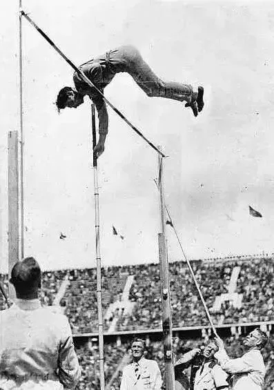 100多年前的圣路易斯奥运会,日本选手富达伊在面对“撑杆跳高”这个项目时,第一次直接把竹竿插在沙池里,自己爬上杆去跳过栏杆。裁判都被他惊呆了,只能临时规定说这不算撑杆跳,要有助跑的才算。在教练的指点下,富达伊又先拿着竹竿跑了一小段,然后停下来把杆插在沙池里,第二次又像猴子一样爬上杆跳过栏杆。