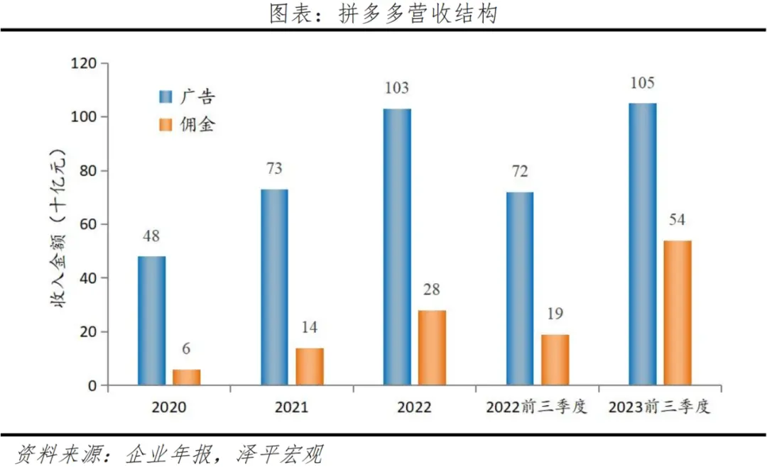 此外,拼多多开始提高佣金。2018年,图书、酒水、大家电、服装等9个品类的佣金为0.6%。到了2021年,“百亿补贴”的数码、美妆、家电等品类佣金上调为1%-3%。2023年,拼多多部分品类的佣金比例已达5%。当其他头部电商平台的佣金收入出现负增长时,拼多多还保持着高增速。2023年前三季度,佣金收入同比增长186%,对营收增长的贡献率达52%,佣金业务体量已达广告的51%,增速为广告的4倍,成为推动拼多多营收增长的第一动力。
