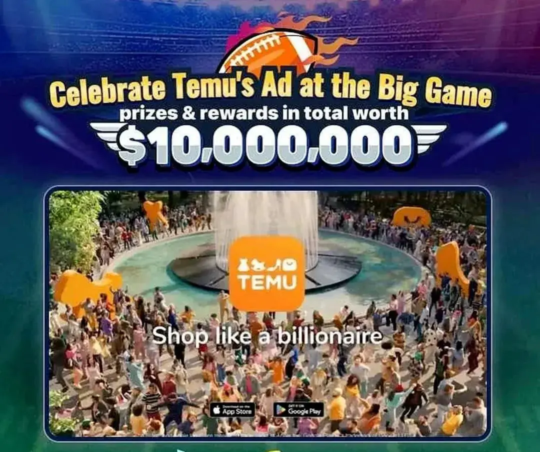 2)超级广告+社交裂变:Temu在Twitter、Facebook等社交平台大量投放广告,根据SimilarWeb数据显示,8月至10月Temu有34%的流量来自付费搜索。Temu在超级碗上以一亿美元的价格买下60秒简单重复、高效洗脑的神曲广告“I'm shopping like a billionaire”,“像亿万富翁一样购物”,快速触达所有目标用户。