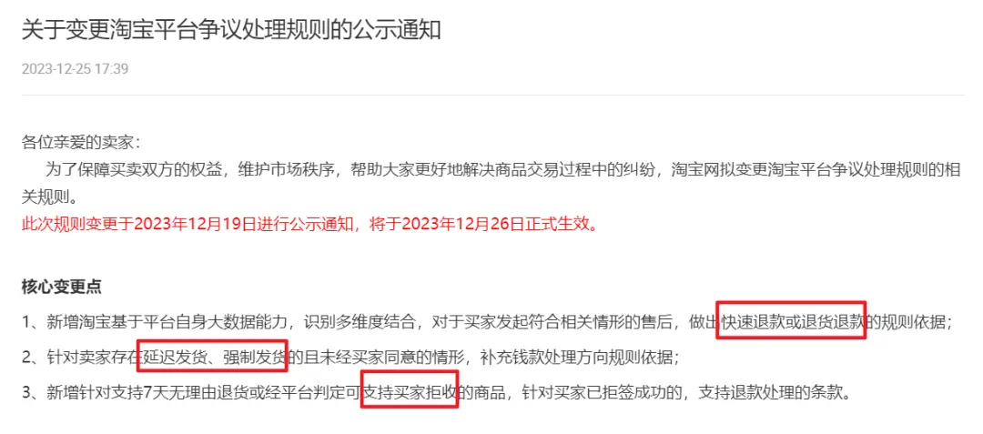 里面不光是规定了仅退款,还有针对延迟或强制发货、买家拒收几种情况的新规则。