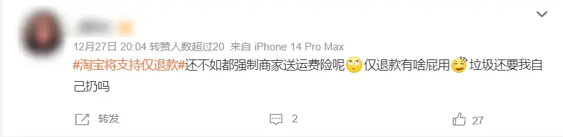 还有很多人在吐槽说,现在运费险越来越贵了。强制平台或者商家提供运费险,比仅退款来得实在多。