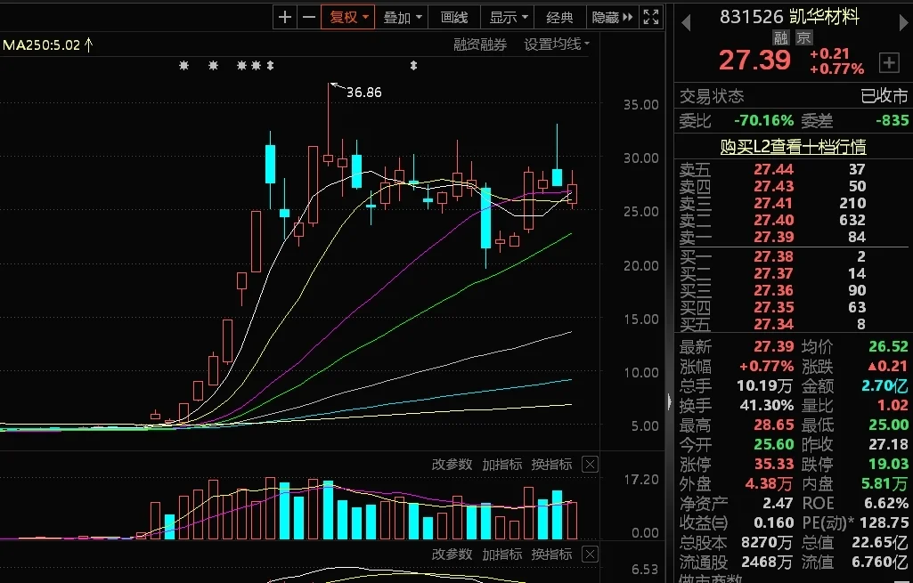 北交所凯华材料以573%的涨幅夺魁,公司主营环氧粉末包封料,10月中旬因为HBM概念走出了一波暴力行情,期间6天5板大涨近364%,随后进入高位横盘状态。目前总市值近22亿元,流通市值近7亿元,近期处于高位横盘状态。
