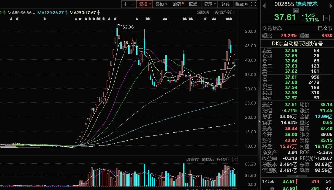 捷荣技术今年累计涨幅377.28%,9月份走出一波21天16板的超级行情,23个交易日大涨420%,并且为四季度的题材炒作打开了空间。公司主营消费电子精密结构件,同时叠加了当时最热的华为mate60手机概念,同时期还有华力创通、光弘科技等一批牛股。