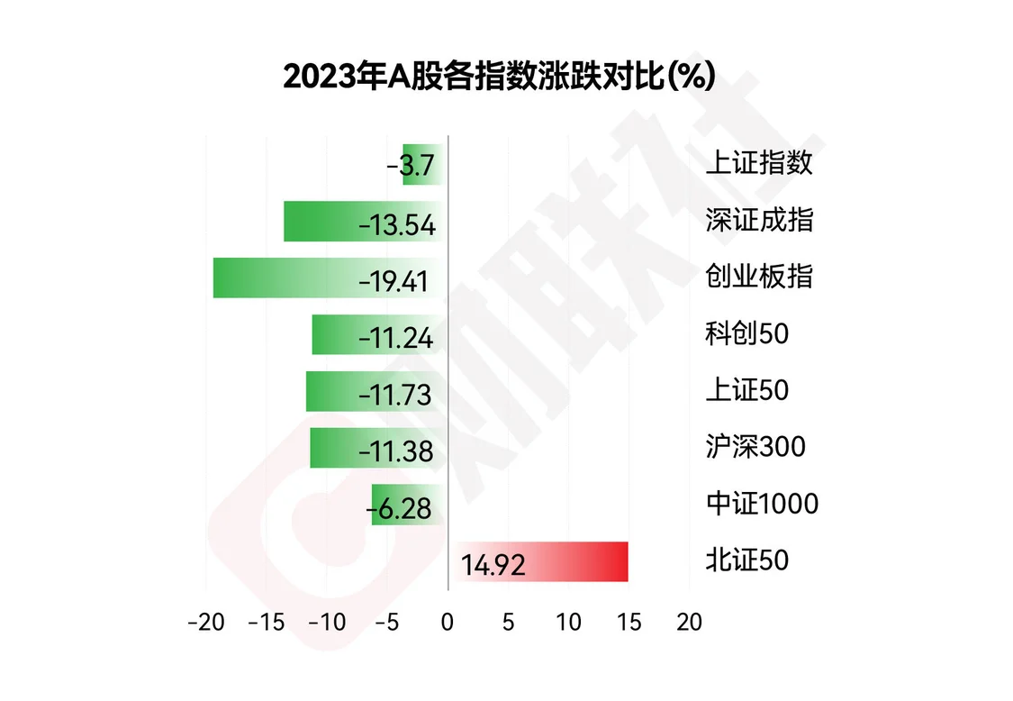 2023年A股市场今日收官,沪指今年收跌3.7%,创业板指跌幅达19.41%,科创50指数跌11.24%,北证50指数四季度走强全年收涨14.92%。