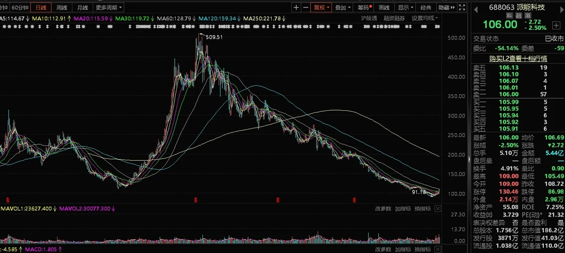 派能科技全年跌幅也超过66%,总市值回落到186亿。公司作为户储龙头,2022年3月从110元附近一路涨破500元大关,随后进入单边回落状态,日K走出了比较明显的A字型。
