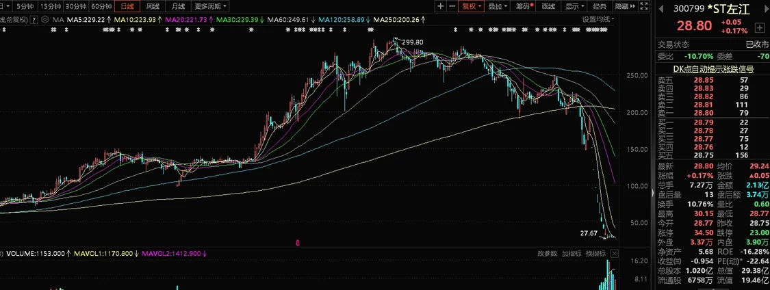 ST左江年末崩盘,今年累计跌幅接近80%。12月13日开始连续多个“20cm”跌停,短短9个交易日累计跌幅高达85%。公司主要从事信息安全领域相关产品,目前不仅面临着退市风险,还因涉嫌信披违法被证监会立案调查。公司2022年营收5896万,亏损1.47亿元;今年前三季度营收3372万,亏损9700多万,如果今年不能扭亏或者营收无法过亿,可能会因为退市规则被强则退市。