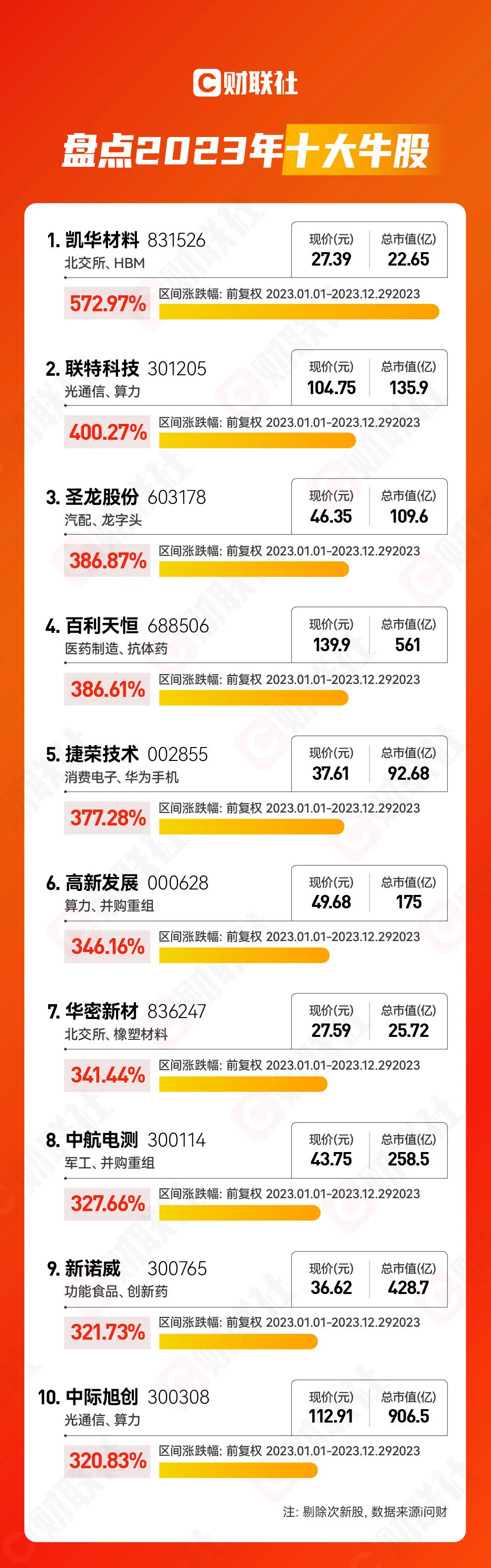十大牛股:北交所凯华材料后来居上,联特科技冲高回落依旧收涨400%