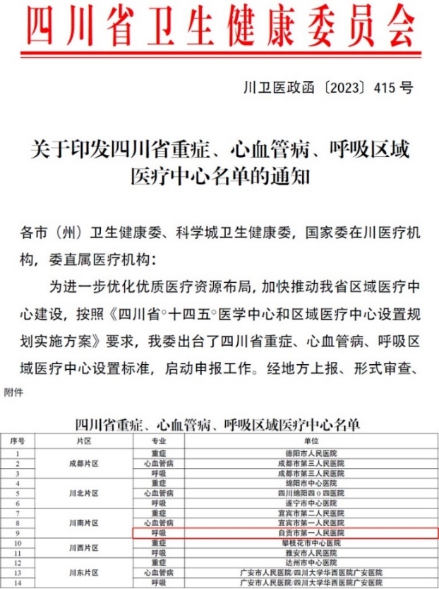 12月28日,四川省首批省级区域医疗中心遴选结果公布,自贡市第一人民医院获批全省首批省级呼吸区域医疗中心。这是该医院医疗事业高质量发展的重要里程碑,也是自贡市呼吸疾病救治能力提升的重要突破。