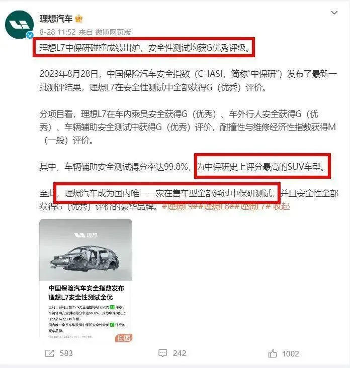 今年8月,理想汽车官方公布了理想L7在中保研的碰撞成绩——安全性测试均获G优秀评级。其中,车辆辅助安全测试得分率达99.8%,为中保研史上评分最高的SUV车型。